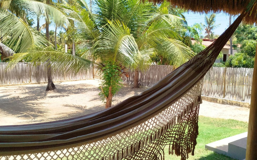 De frente para o vento, a casa conta com um amplo jardim bem ventilado, ideal para relaxar no lounge externo ou nas redes na varanda.